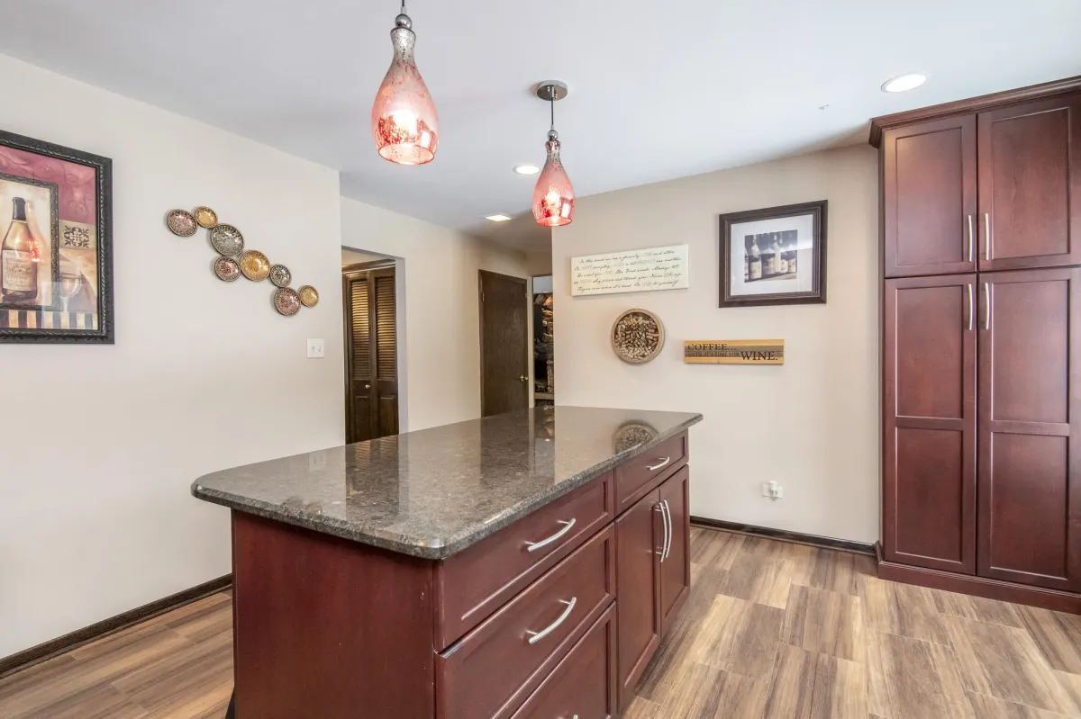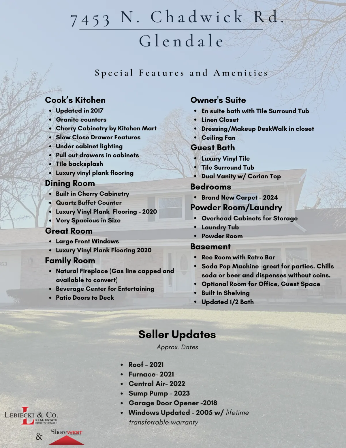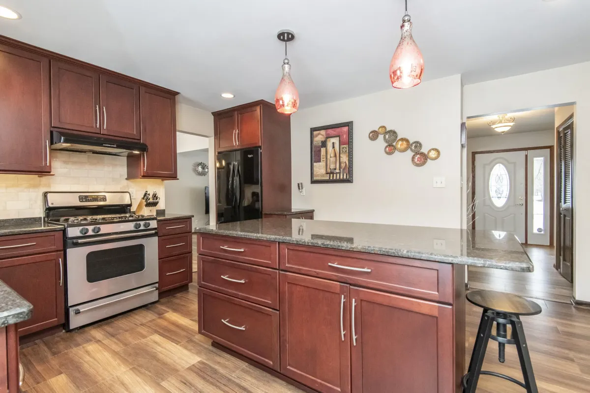 Step into comfort and style in this 4-bedroom home in Glendale, WI. The kitchen is a standout with granite countertops, cherry cabinets, and stainless steel appliances—modern and tasteful. The living room, featuring cherry plank flooring, is inviting and cozy. Host many gatherings in the dining room with its built-in buffet and cherry cabinetry. Relax in the family room, complete with a natural fireplace, beverage station and access to the deck. Convenient main-floor laundry and a powder room add practicality. Upstairs, unwind in the primary suite with a nicely tiled tub surround, walk in closet and vanity desk. The second full bath, with double sinks, serves three of the four bedrooms, now adorned with brand new carpet. Entertain or unwind in the lower level rec room with a retro bar, fridge, and soda pop machine. With newer mechanicals and roof, this home combines comfort and functionality. Embrace a blend of classic charm and contemporary living in this welcoming Glendale residence.